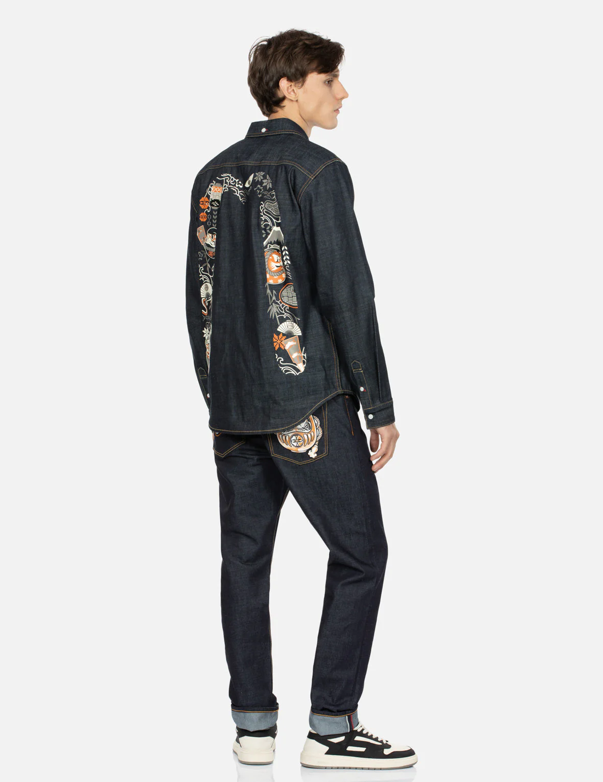 EVISUs dark indigo denim shirt is cut for a regular fit, perfect for layering when the temperature drops. Its back panel is decorated with Daicock in allover Kumadori Drauma and snowflake pattern, while the front pocket is peppered with a nordic style logo.