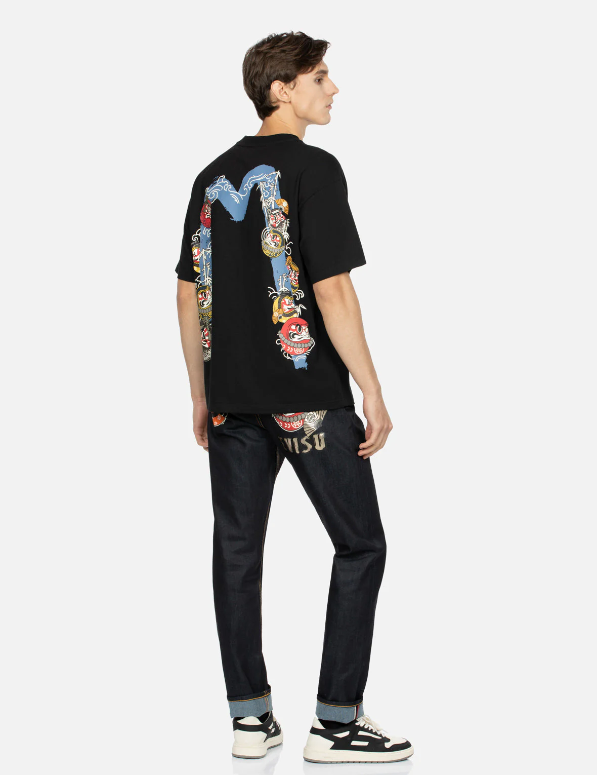 - Kumadori Daruma graphic and EVISU logo print