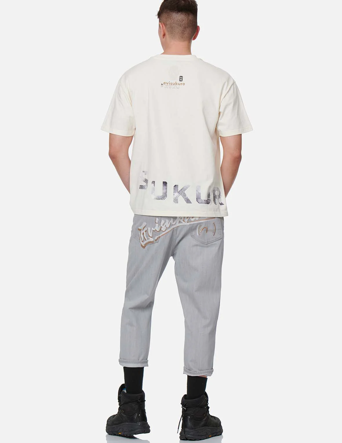 This light grey pair of denim jeans in cropped length is major for summer looks. Featuring a drop-crotch design, the back panel of these jeans is emblazoned with colour blocking Kanji and logo embroidery to channel 3D effect.