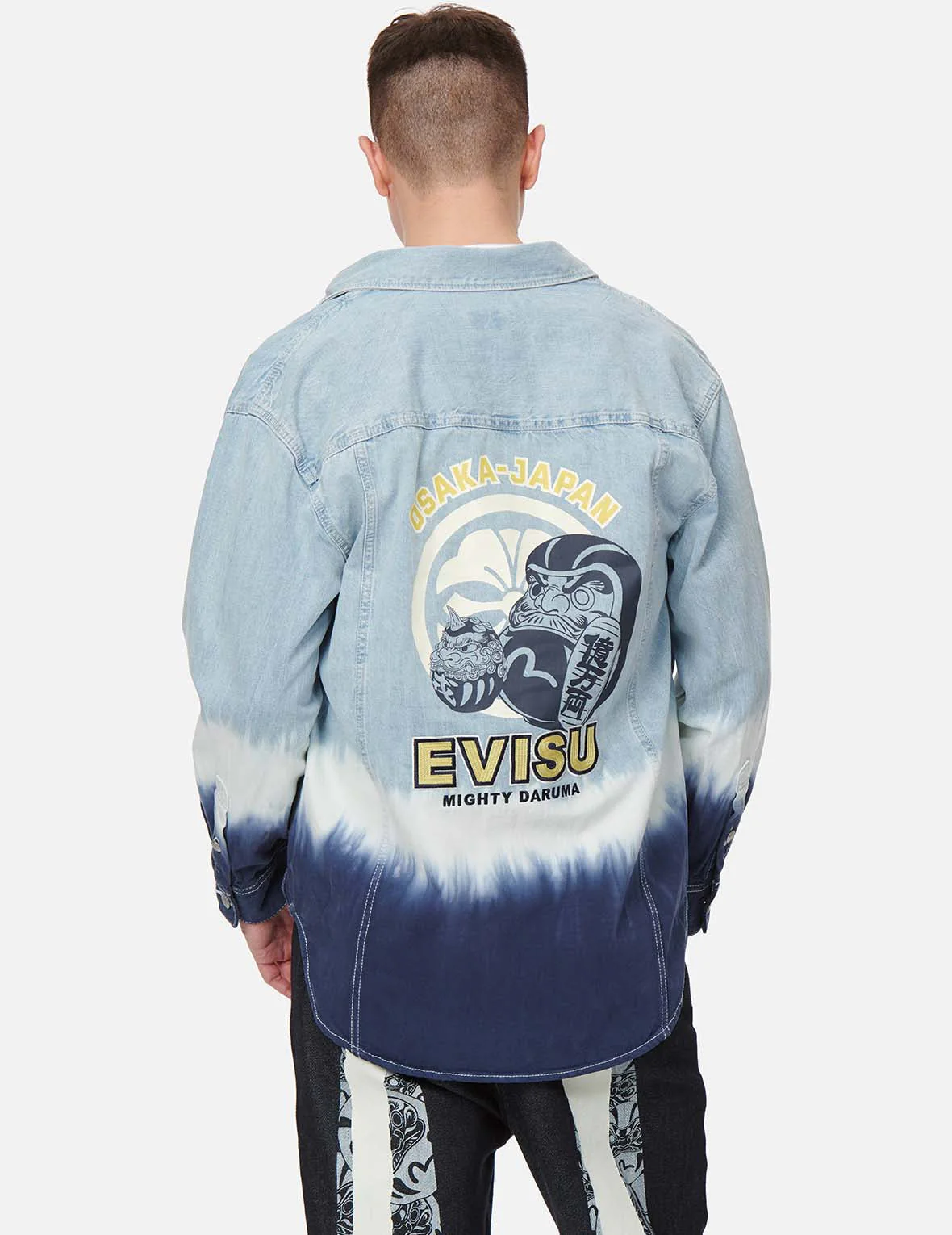 Inspired by the summer sea view, this denim shirt jacket is tie-dyed for gradated blue palette, featuring a back print of Daruma Buddies and Kamon. Logo and Japanese proverb Never give up are embroidered to display a trendy style.